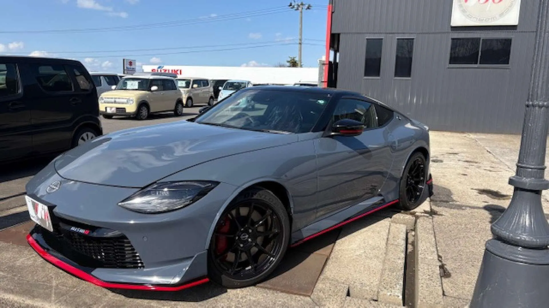 朝のショールーム前、澄んだ空気の中に一台のスポーツカーが静かに佇んでいます。